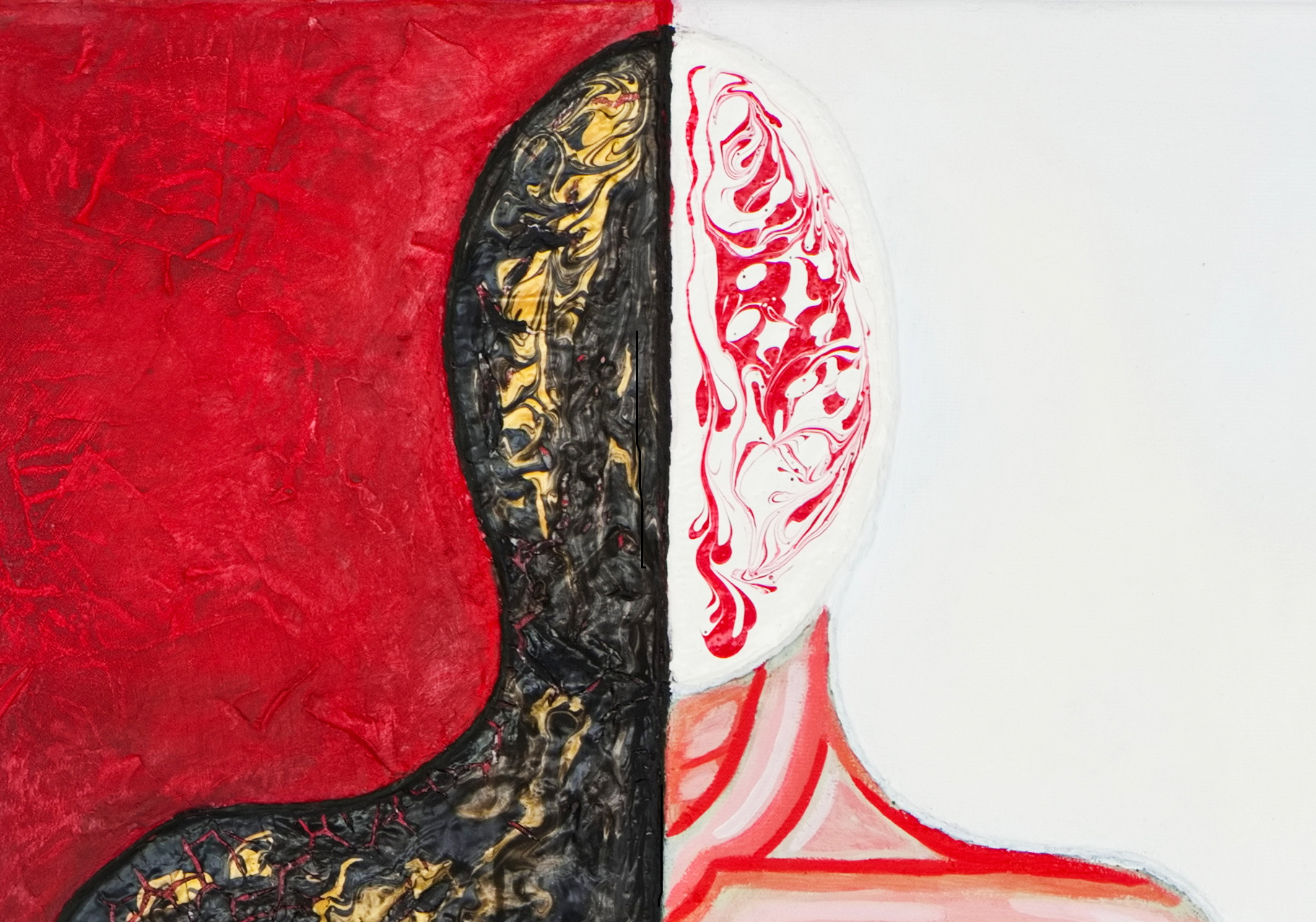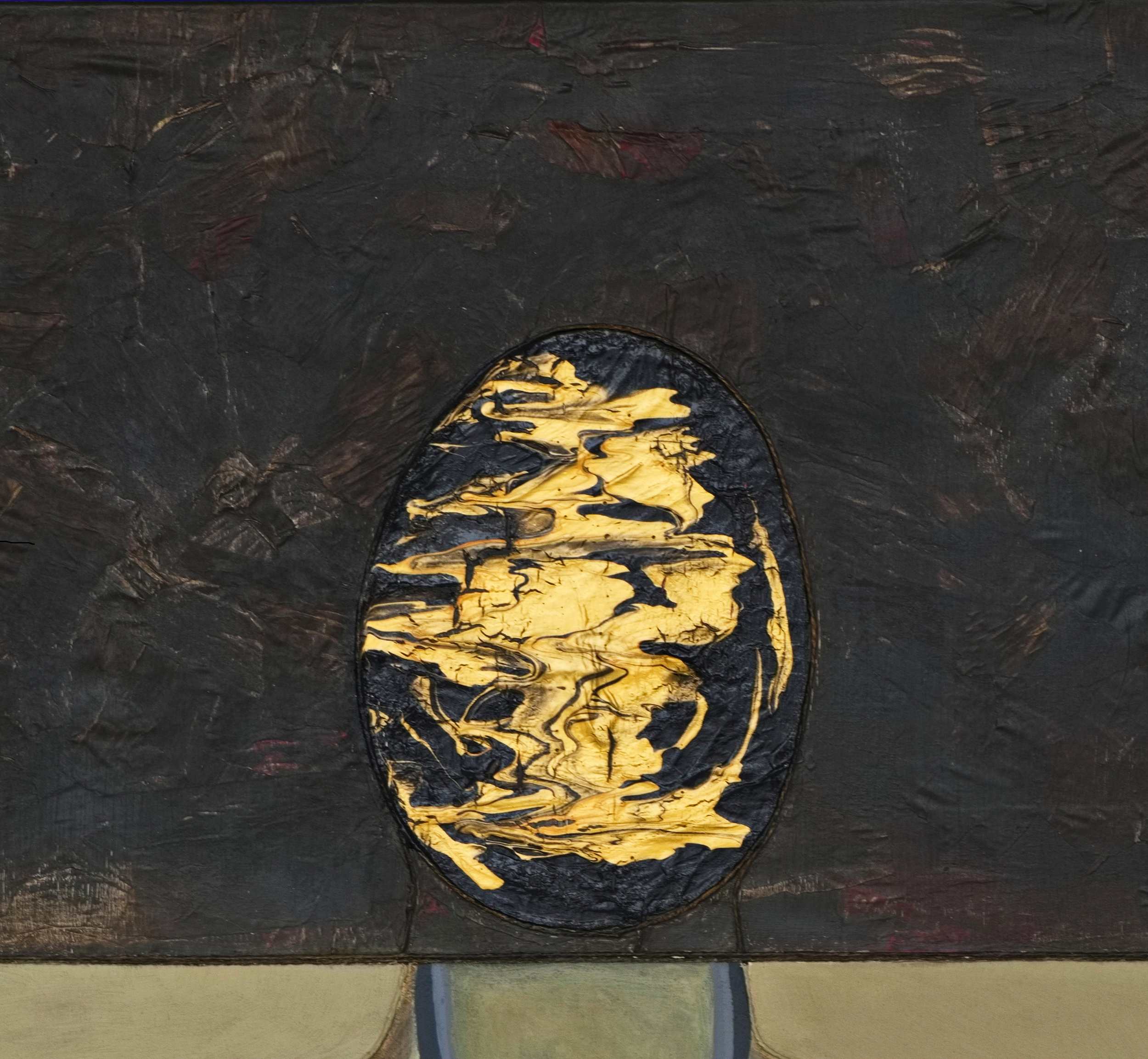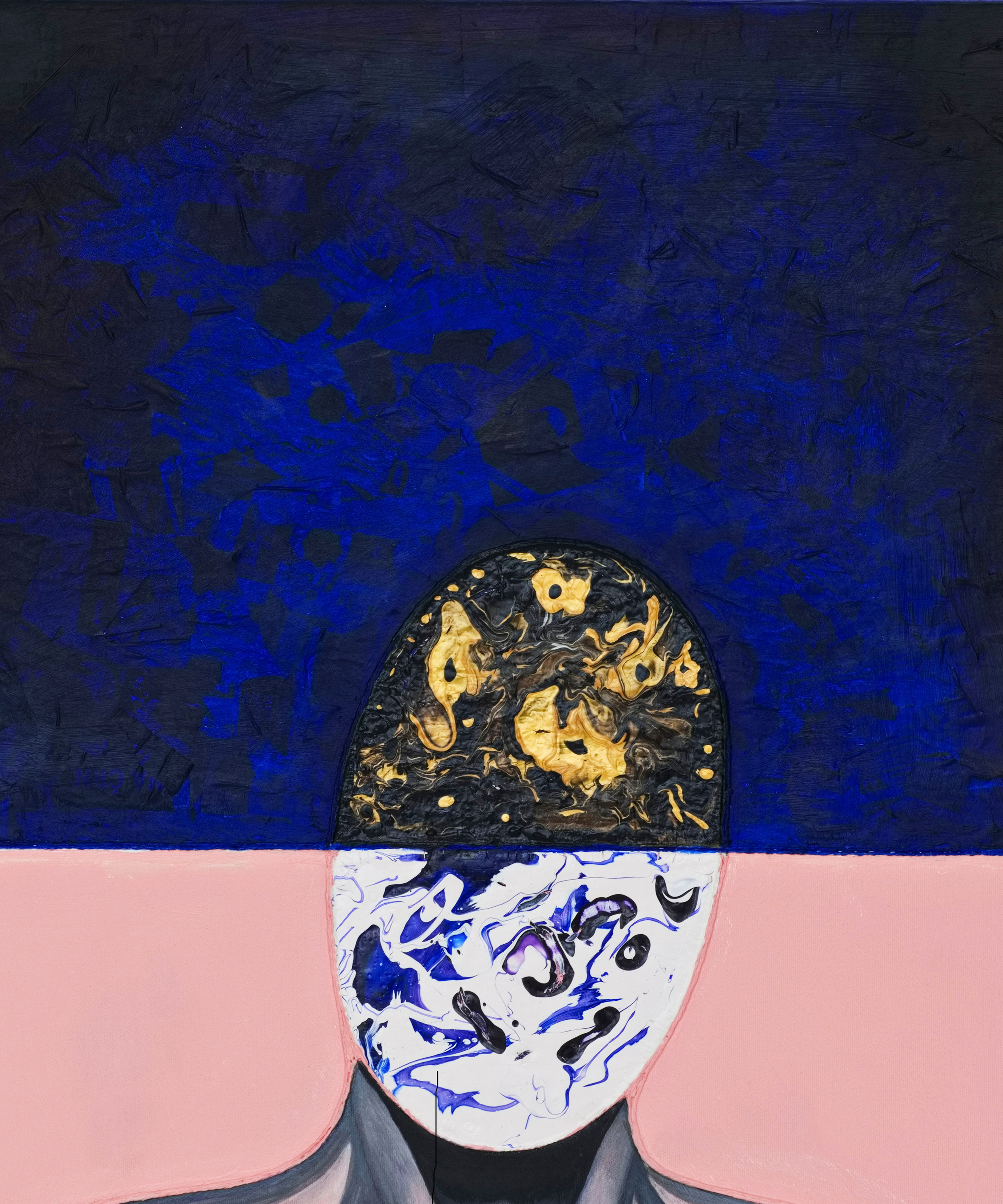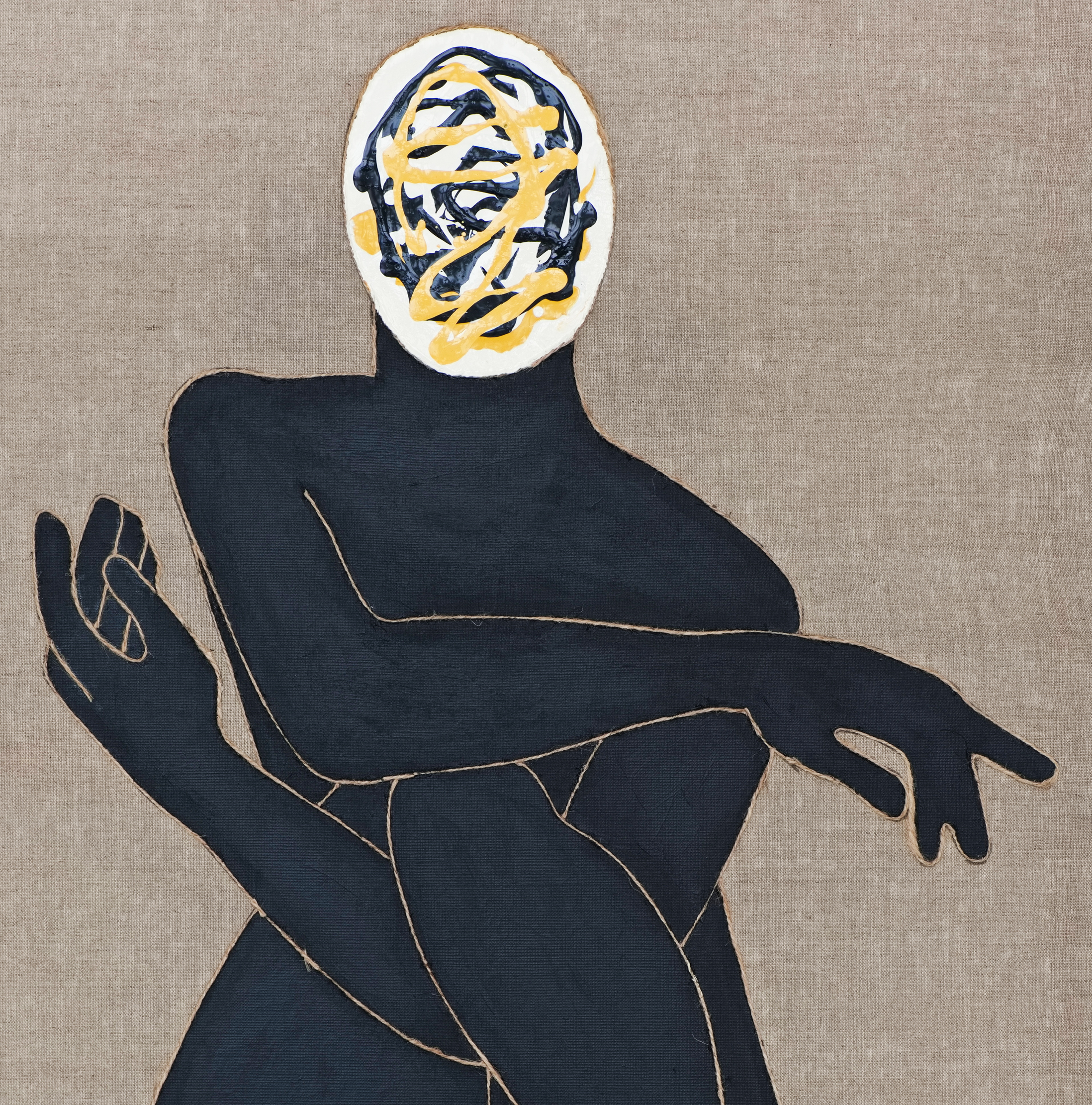 Rather than serving decorative purposes, materials function as active compositional tools that define depth, edge, and visual weight. Pouring methods introduce fluidity and chance, while the integration of paper rope and textured elements establishes rhythm, tension, and structural continuity across the composition.